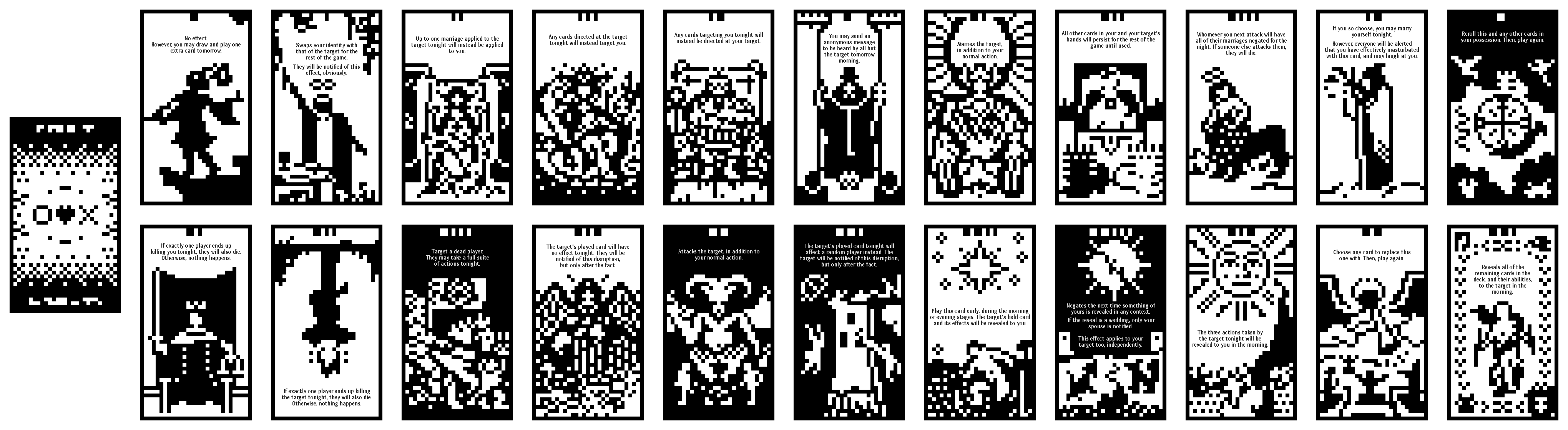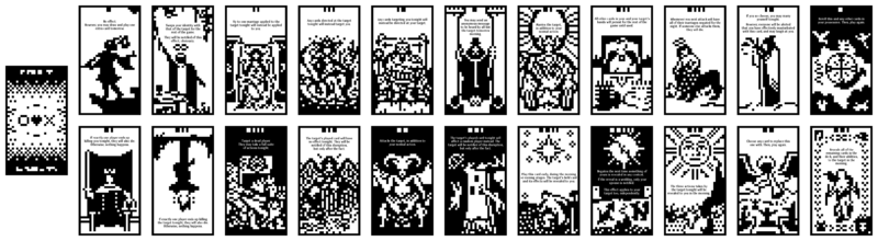 A spread of all 22 cards used in FMK, as well as the graphic used when face-down.